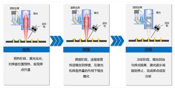 激光锡丝焊接:这是一个“动态”的增材过程。系统通过精密的送丝机构,将成卷的固态锡丝(通常为内置助焊剂芯的药芯锡丝)精确地送至待焊接点。几乎在同时,激光束照射在锡丝末端和焊盘表面,使其瞬间熔化并润湿铺展,形成焊点。整个过程犹如一位精准的机器人焊工,手持“激光烙铁”进行点焊。