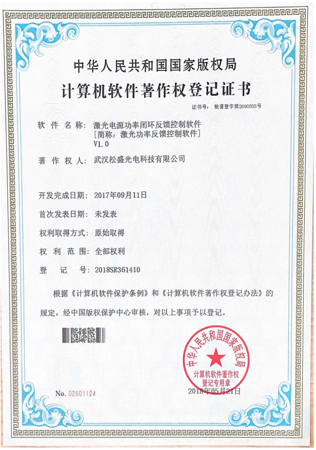激光电源功率闭环反馈控制软件V1.0证书
